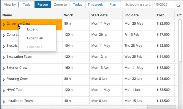 Expand and collapse all groups now enabled when the Gantt chart is grouped by resource