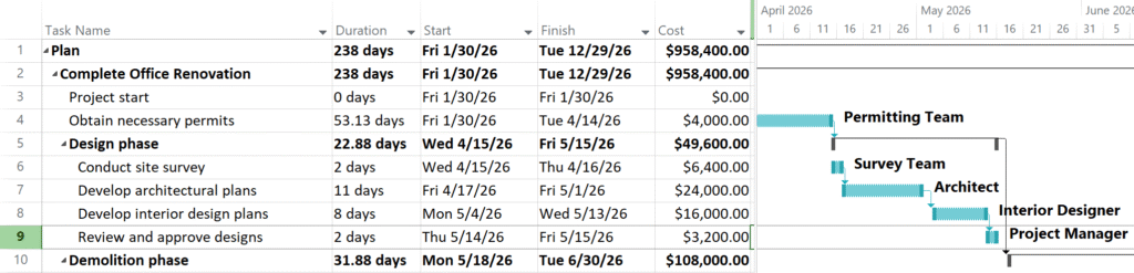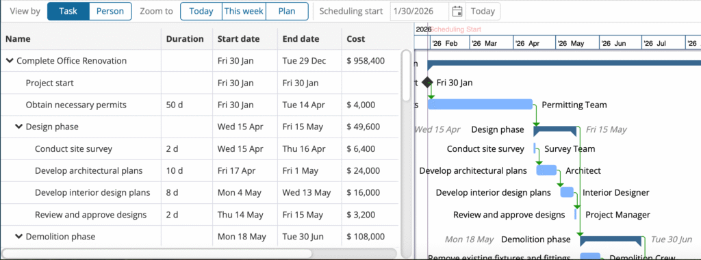This makes Microsoft Project a powerful companion to GamePlan for users who want to leverage Project’s reporting, dashboards, or alternative Gantt chart presentation, while continuing to use GamePlan for fast, visual schedule creation and refinement.