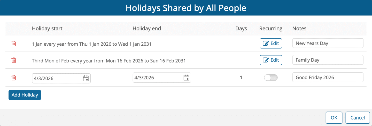 Previously, holidays had to be entered individually for each year. For multi-year schedules, this often meant creating dozens of holiday entries just to account for the same dates repeating annually. With recurring holidays, holidays that follow a pattern only need to be defined once, along with their recurrence rules.